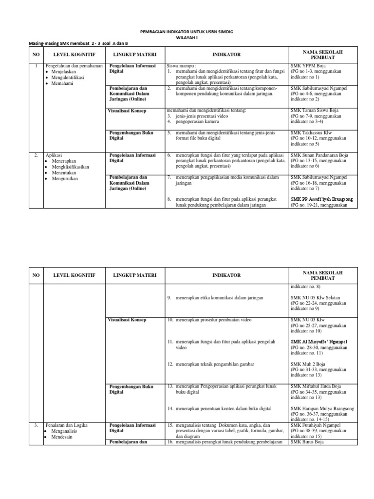 Pembagian Indikator Soal Usbn Simdig Wilayah I Pdf