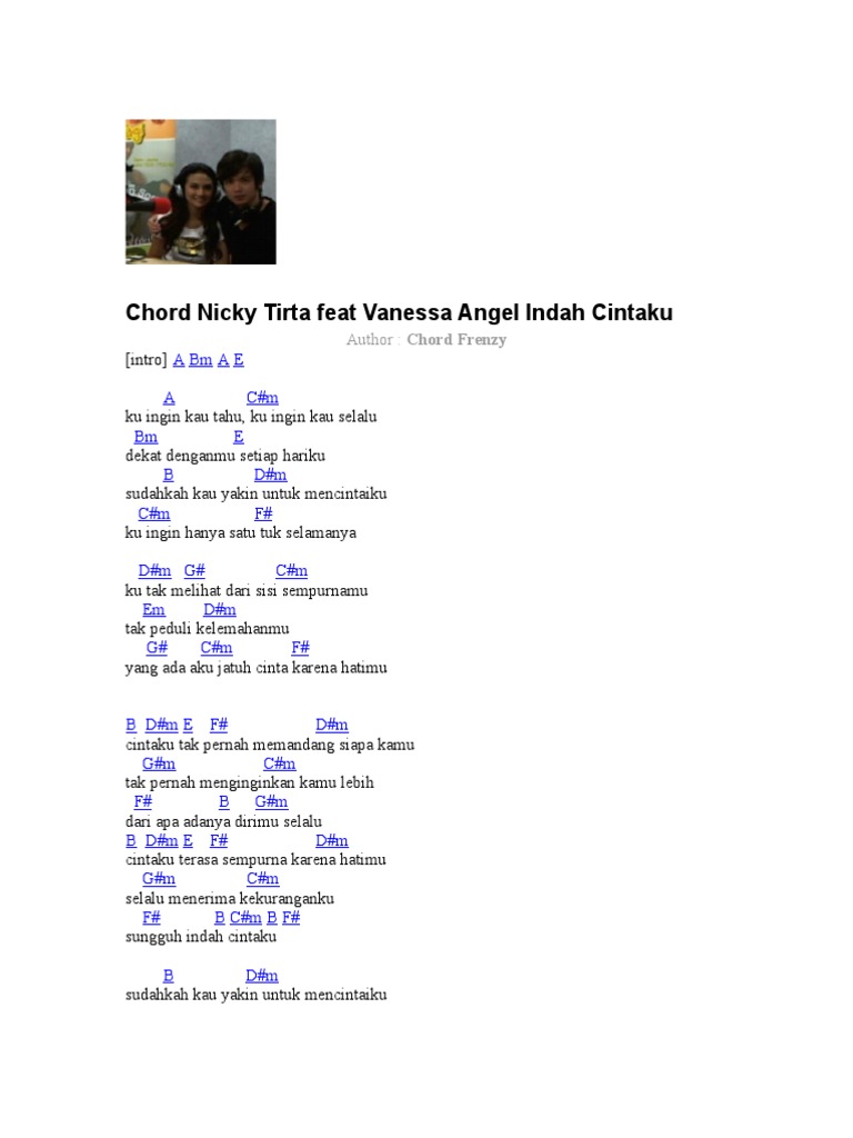 A Cm ku ingin kau tahu ku ingin kau selalu Bm E dekat denganmu setiap hariku B Dm sudahkah kau yakin untuk mencintaiku Cm F. A Bm A E. Chord Nicky Tirta feat Vanessa Angel Indah Cintaku intro A Bm A E A Cm ku ingin kau tahu ku ingin kau selalu Bm E dekat denganmu setiap hariku B Dm sudahkah kau yakin untuk mencintaiku Cm F ku ingin hanya satu tuk selamanya Dm G Cm ku tak melihat dari sisi sempurnamu Em Dm tak peduli kelemahanmu G Cm F yang ada aku jatuh cinta karena hatimu.