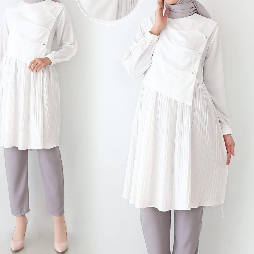 L M N 0545 Atasan Tunik Tunic Broken White Putih Tulang Kombinasi Plisket Variasi Pita Size L M Shopee Indonesia