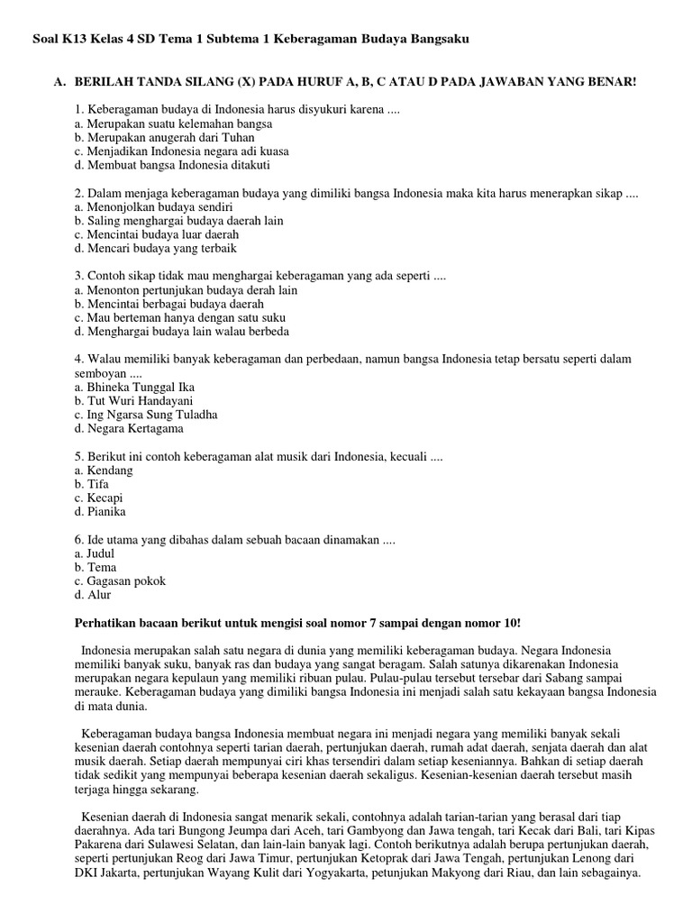Soal K13 Kelas 4 Sd Tema 1 Subtema 1 Keberagaman Budaya Bangsaku
